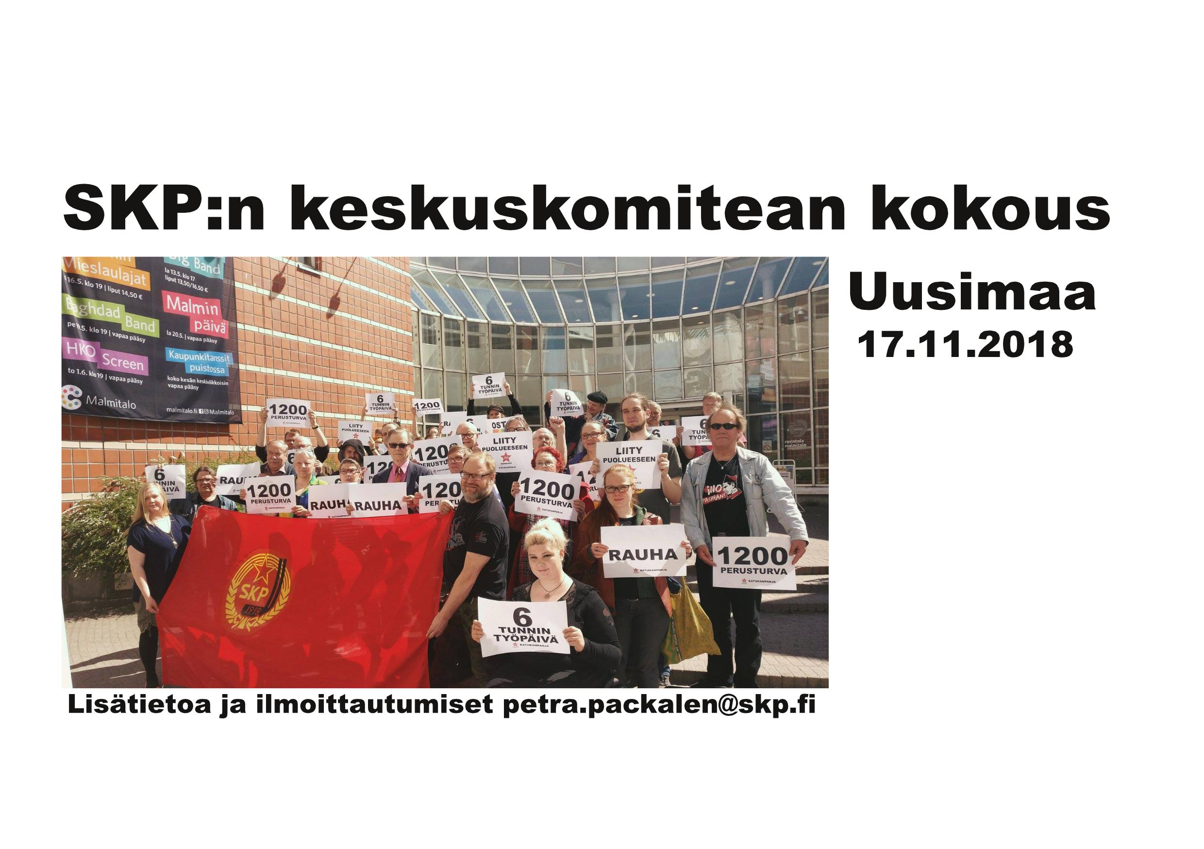 SKP:n keskuskomitean kokous Uudellamaalla 19.11.2018. Aika ja paikka tarkentuvat. Kokous alkaa klo 11 (suunnitelma)